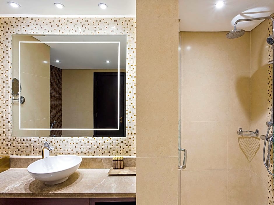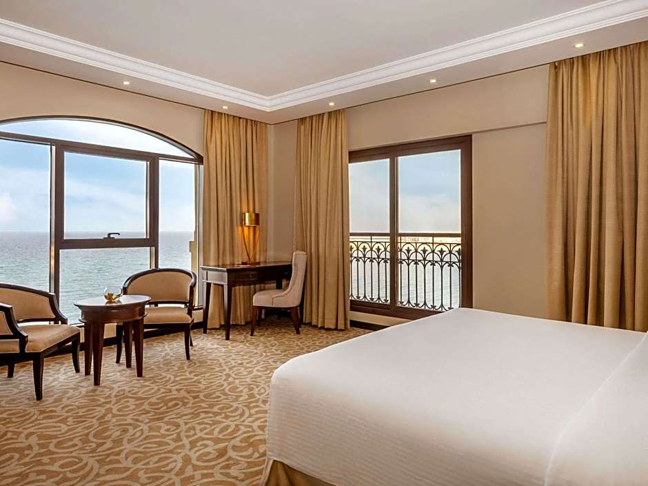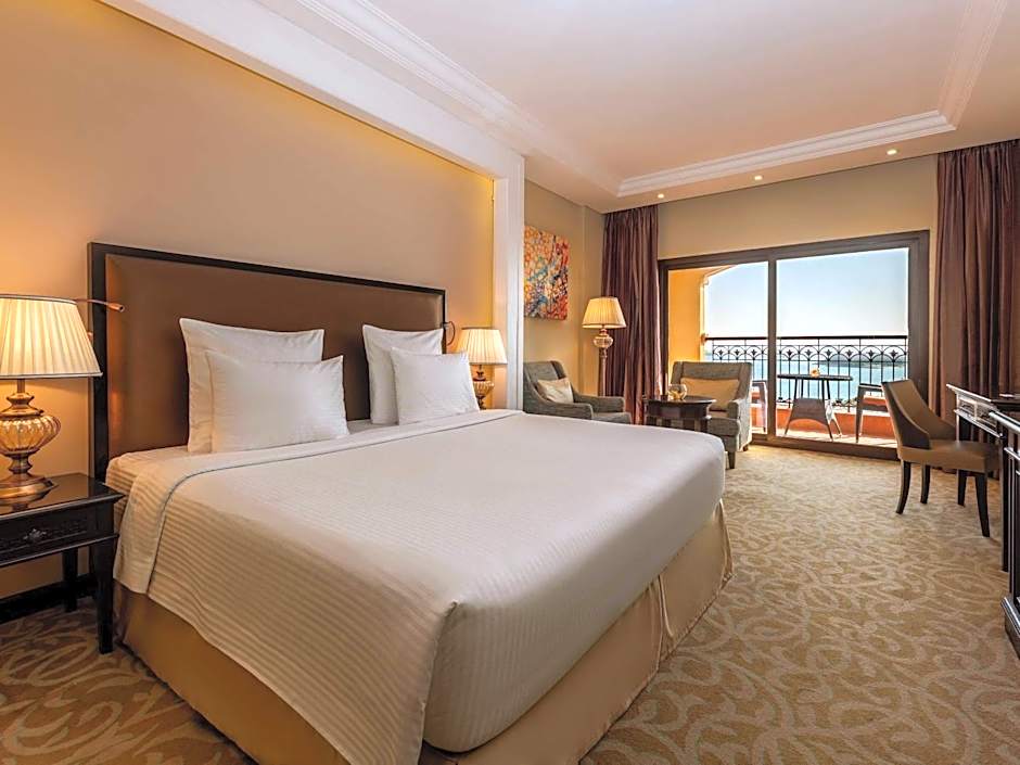 The spacious 44 sqm Premium King room offers a king size bed, separate sitting area, 40” large interactive TV and a private balcony with stunning views of the Gulf.